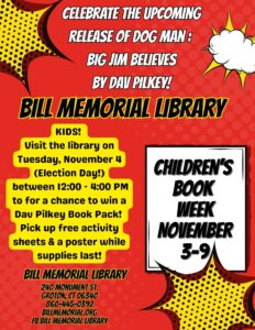 Kids, come celebrate Children’s Book Week (Nov. 3-9) and the upcoming release of Dog Man: Big Jim Believes by Dav Pilkey by entering for a chance to win a Dav Pilkey Book Pack! Also pick up free activity sheets and a poster (while supplies last).