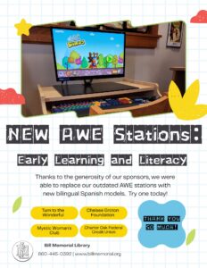 The Bill Memorial Library of Groton has replaced its outdated early learning & literacy (AWE) stations with new, bilingual Spanish models. Funding for this venture was generously provided by the Chelsea Groton Foundation, Turn to the Wonderful, the Mystic Woman’s Club, and Charter Oak Federal Credit Union.