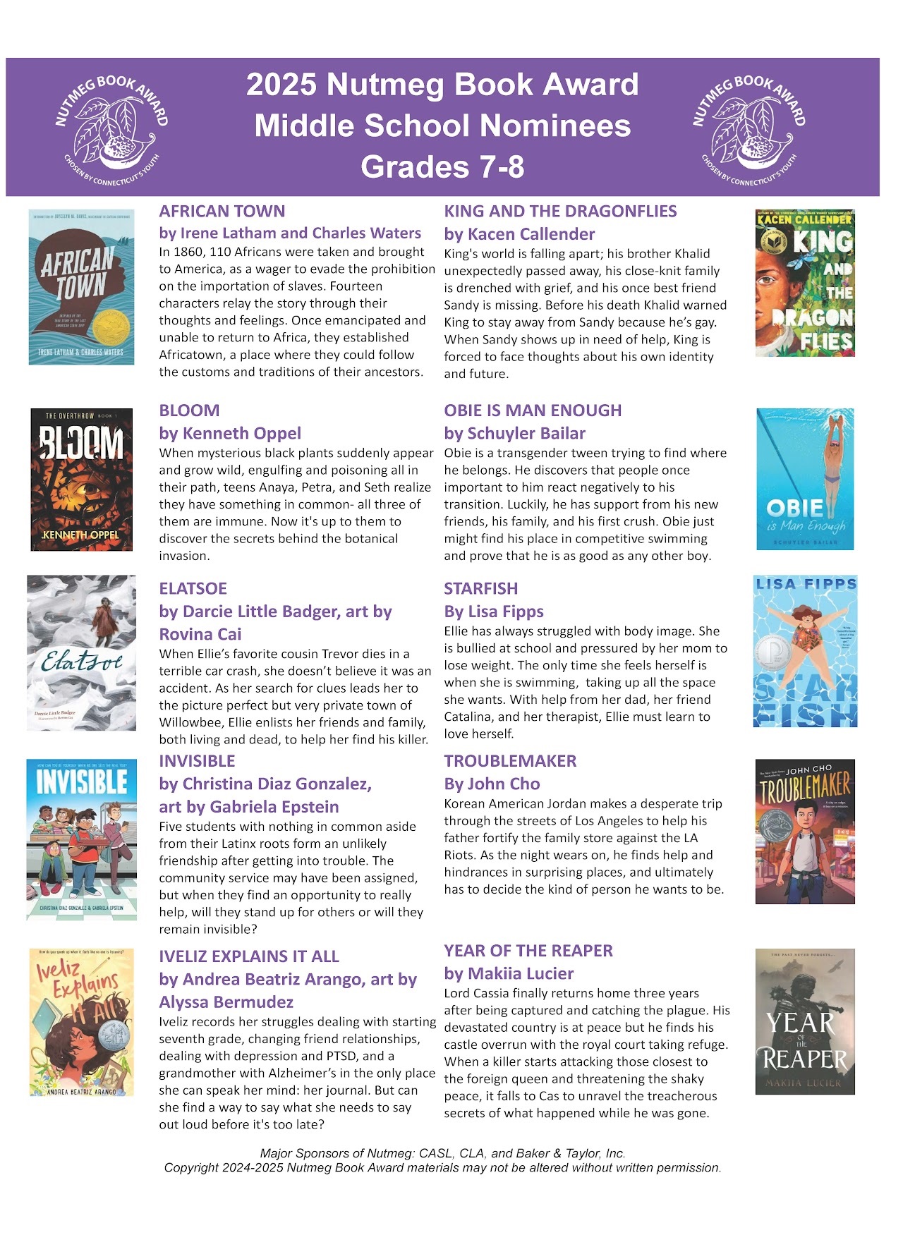 The goal of the Nutmeg Book Award is to encourage children in grades 2-12 to read quality literature. The nominees are all published within the last five years, and are works of fiction or narrative nonfiction. Children’s librarians and school media specialists pick the nominees.